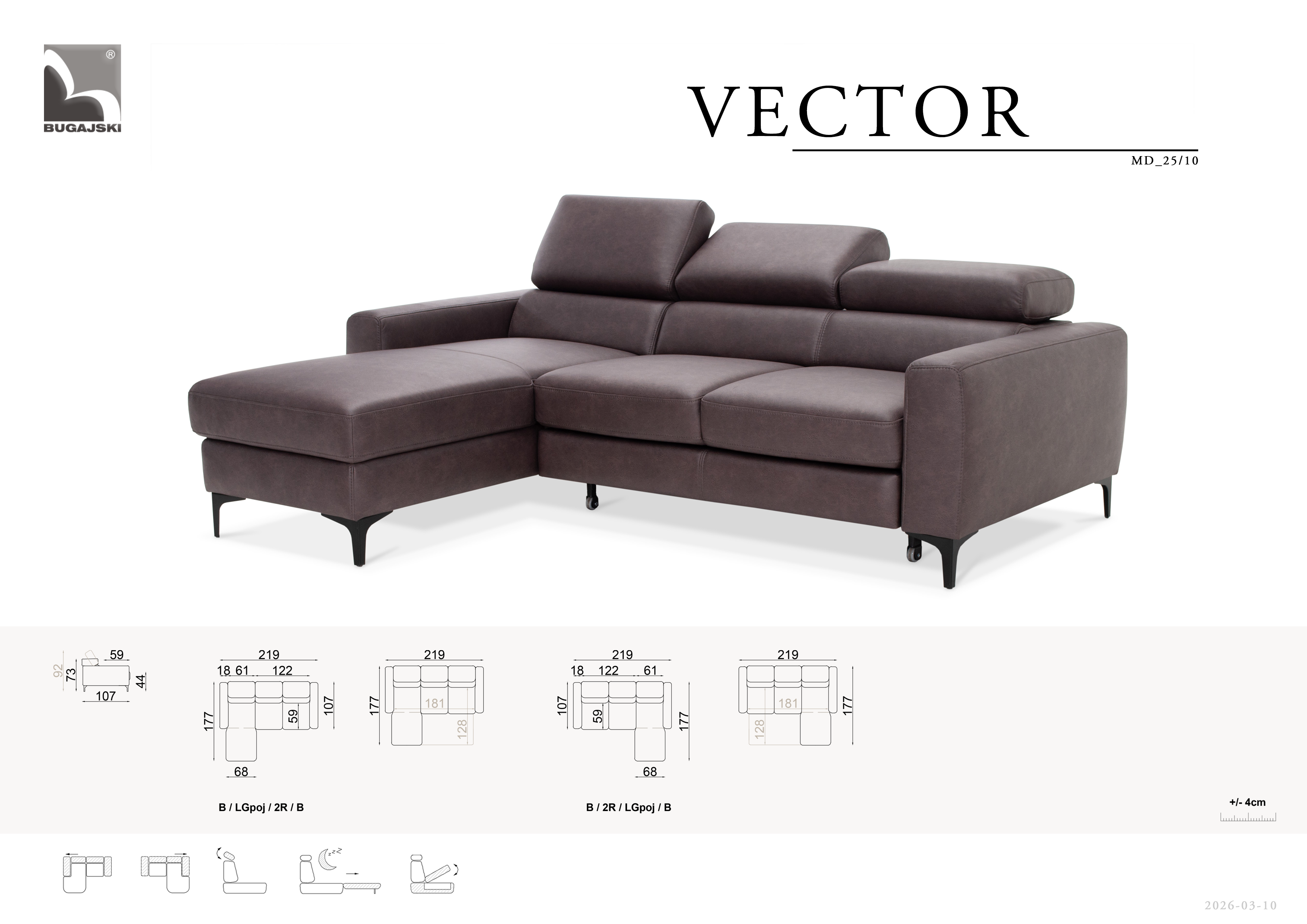 Model posiada podręczny pojemnik do przechowywania w części rogowej. Dodatkowym atutem są ruchome, wielostopniowe zagłówki oraz funkcja spania.